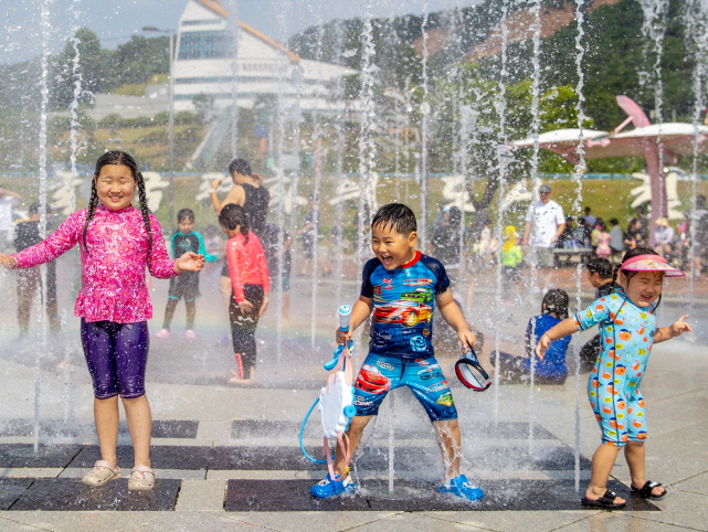【경상포커스=전상철기자】대구와 경북 대부분 지역에 폭염경보가 내려진 6일, 무더위도 삼남매의 웃음만큼은 막지 못했다. 칠곡보생태공원 바닥분수에는 시원한 물줄기와 함께 아이들의 환한 웃음이 퍼져나갔다.