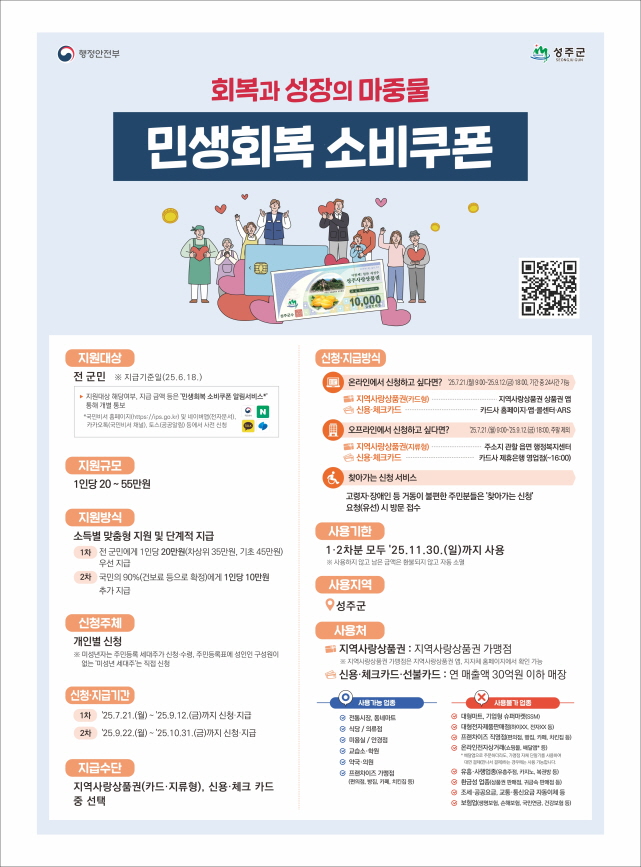성주군, 민생회복 소비쿠폰 1차 신청 개시![]() 【경상포커스=김경희기자】성주군은 오는 21일부터 ‘민생회복 소비쿠폰’ 1차 신청을 받는다고 밝혔다.