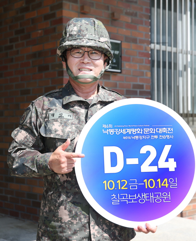백선기 칠곡군수는 지난 18일‘칠곡군 통합방위협의회’가 열린 칠곡2대대에서 전투복을 입고 내달 12일부터 14일까지 열리는‘제6회 낙동강세계평화 문화대축전’홍보에 나섰다.