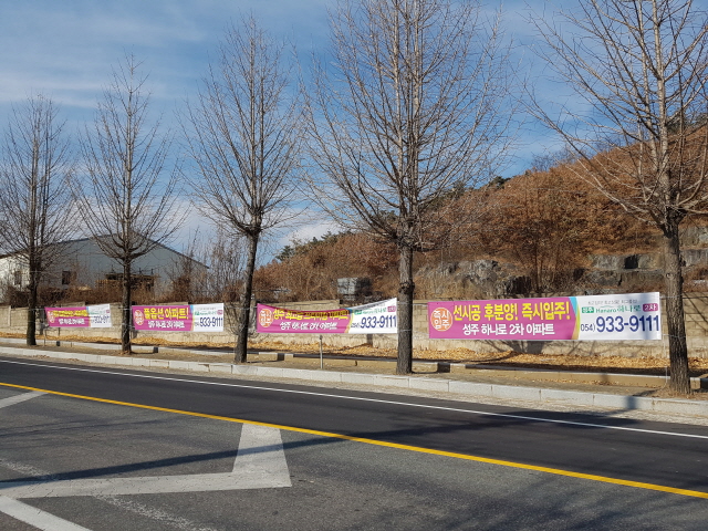 성주한전 사거리 등에는 구미, 칠곡지역과 관내 아파트 분양 광고 현수막들이 마치 성황당에 온 것처럼 걸려 있다.